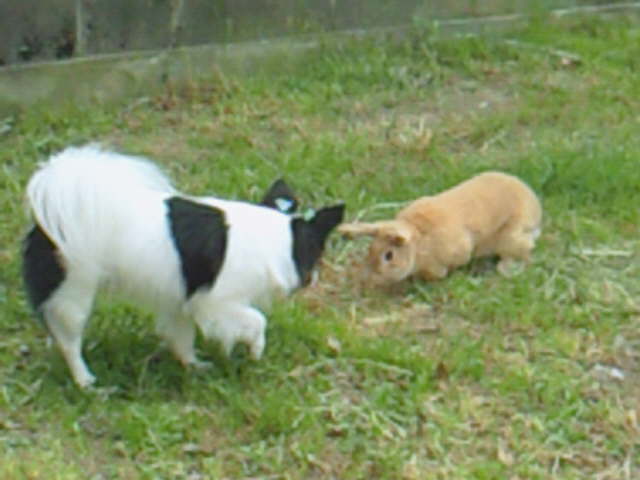 お隣で飼われている ウサギのラッキーくんと ジルが仲良く遊んでいます