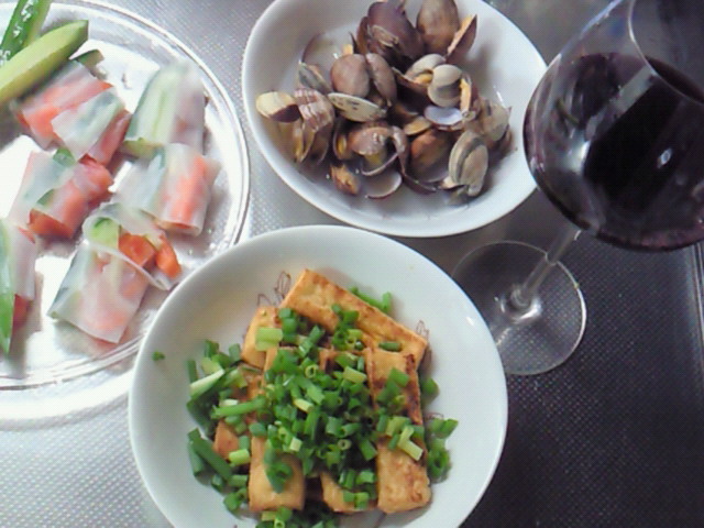 あさりの酒蒸し 胡瓜とサーモンの生春巻 絹厚揚げ焼