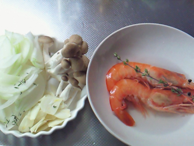 オリーブオイルにニンニクの中に アルゼンチンエビ入れて